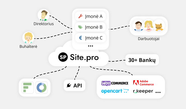 Įjungus integraciją, užsakymų duomenys automatiškai perduodami į „Site.pro“: tai apima klientų informaciją, pardavimo sąskaitas, prekių nurašymo aktus ir kitus reikalingus apskaitos duomenis. Tai leidžia sumažinti rankinės buhalterijos poreikį ir ženkliai sumažina klaidų riziką.